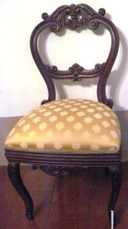 - Cadeira isabelina en madeira de caoba tallada con motivos vexetais, tapicería de cor amarelo, apoiada en catro patas cabriolé. Respaldo curvo.