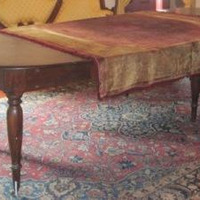 - Mesa comedor estensible en dúas fases, en madeira de caoba, de planta ovoidal, con lixeiro faldón na cintura e apoiada en seis patas abalaustradas, bulbosas no imóscapo e estranguladas cabo dos pés, que van sobre cadansúa roda.