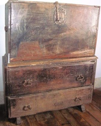 - Bargueño en madeira de castiñeiro. Composto de dous corpos: o inferior, un taquillón soporte do escritorio, é un caixón de taboleiros enteirizos ensamblado con cola de miñato con dous caixóns na cara frontal, grandes e con dúas asas de ferro recurvadas, en forma de C invertida; vai apoiado este corpo en dúas zapatas coa súa face tallada en estrías; o contador superior, ensamblado en cola de miñato reforzado con cantoneiras de ferro forxado e bisagras flordelisadas, organízase en once gabetas con tirador central circular en madeira tallada, flanqueado o tirador por placas resalteadas de perfil ovalado e resalte central, e orlado o perímetro cunha grilanda tallada policromada en vermello. Os caixóns arrodean unha lacena central con pechadura. Conta con tapa abatible mediante bisagras e perno de feche superior. A fechadura da tapa vai ornamentada cun palastro de ferro forxado con tracería calada. Nos costados, asas de ferro forxado, curvas e abalaustradas.