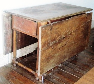 - Mesa estensible de dúas ás abisagradas, en madeira de castiñeiro; con seis patas lisas con chambrana torneada, dúas delas abatibles. O corpo conta con dous caixóns laterais.