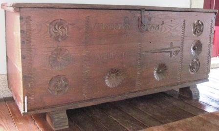 - Arca de gardar en madeira de castiñeiro, de taboleiros enteirizos ensamblados en cola de miñato. Vai apoiada en dúas zapatas. A face frontal vai tallada con hexapétalas e unha espada rudimentaria, motivos de obvia significación apotropaica. Tamén consta da inscrición :"YZOLA DOMINGO ANTº","ANO DE 1759". Pechadura de ferro forxado con perno e palastro embelecedor.