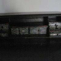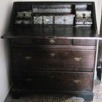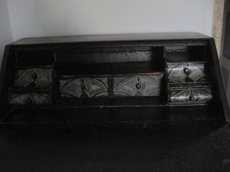 - Moble buró escritorio en madeira de castiñeiro con dous corpos: o inferior consta de cinco caixóns; o superior, retranqueado e con tapa frontal abatible, con seis pequenos caixóns no interior, pintados en tons verdes e algún deles con secreters.