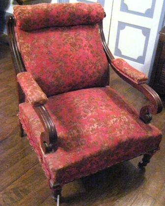 - Butaca tipo Voltaire en madeira de caoba con tapicería en tons roxos con motivos florais en marrón, respaldo recto e dous apoiabrazos avolutados. Patas dianteiras troncocónicas e molduradas provistas de pequenas rodas.