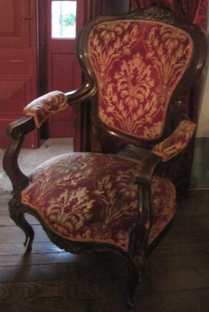 - Butaca isabelina de mediados do XIX en madeira de caoba tapizado en tea de veludo en tons granates e ocres con motivos vexetais, dous apoiabrazos, respaldo trapezoidal con remate floral e patas cabriolé.