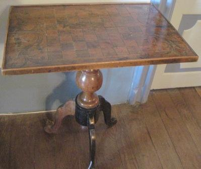 - Mesa de xogos co taboleiro do xadrez debuxado e nos extremos motivos vexetais de roleos, que se sostén nun soporte central rematado en tres pequenas patas avolutadas.
