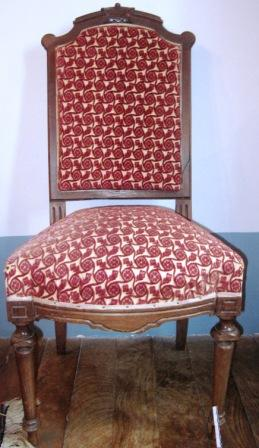- Cadeira de catro patas torneadas en aneis, ao estilo Rexencia inglés, e tapizada en tons granates e amarelo.