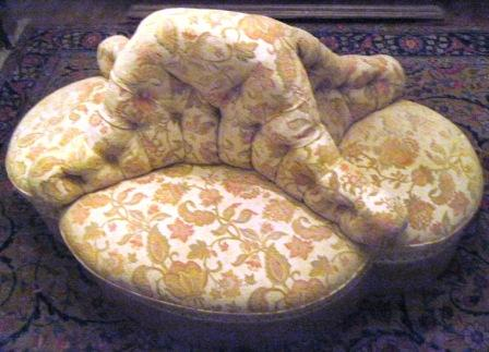 - Confidente de catro corpos. Parte central con capitoné. Tapizado en tons ocres con motivos florais tipo Paisley e rematado en flocadura perimetral no faldón con pasamanerías de cordón. Apoiado en dez patas con rodas.