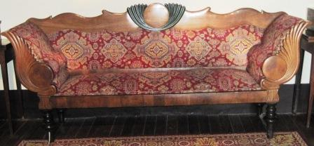 - Sofá de tres prazas tipo Biedermeier, con respaldo e apoiabrazos en forma de palmeta e copete vexetal, laterais e asento acolchado tapizado á otomá en tea de veludo en tons amarelos, roxos e ocres. Apoiado en catro patas en madeira torneada en cor negro.