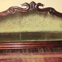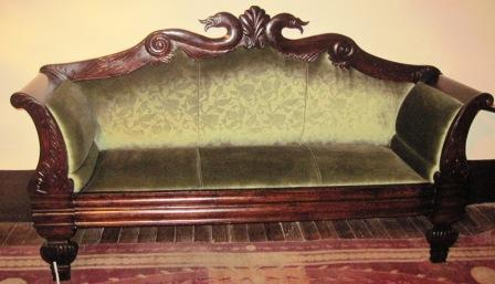 - Desde o punto de vista tipolóxico, o sofá ou canapé xurdiu a finais do XVIII como leito de reposo no que se deitar á turca. Canto a este en particular, sen prexuízo do motivo decorativo dos cisnes tallados no respaldo, tan característicos do estilo Fernandino (arremedo un chisco tosco do estilo Imperio francés), anticipa o gusto isabelino polos perfís curvos e tallas aplicadas no copete e no anverso dos brazos e cintura, así como polo tapizado en seda, nunha búsqueda da comodidade en detrimento dos materiais e técnicas decorativas.