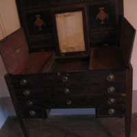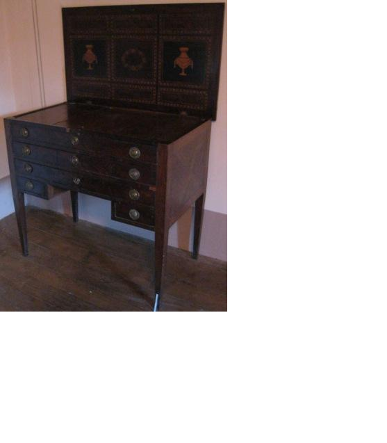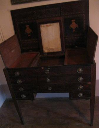 - Toucador estilo Carlos IV con embutidos en marquetería de madeiras nobres con dous caixóns pequenos, outros dous máis grandes e, na parte superior, tres apartamentos para gardar obxectos; na central, un marco para un espello móbil, a modo de psiqué. Tiradores en bronce e tapadeira abatible. Patas afusadas e motivos ornamentais estilo Imperio (xarróns e grilanda floral central)