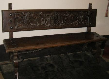 - Banco dos chamados "de espaldar" en madeira de castiñeiro. Respaldo en madeira tallada con relevos de híbridos de léon acantizados que flanquean o escudo heráldico do Pazo (1er cuartel: Garza de Castillón, 2º: Sarmiento, 3º: Quiroga de la Puebla, 4ª Cuartel: Valladares). Catro patas en madeira torneada aseguradas por fiador en ferro forxado.