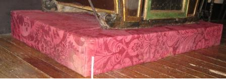 - Soporte de forma rectangular donde está apoiada a liteira, en madeira tapizada con tea de damasco de seda natural de cor vermello.(A tea de damasco pertence ao século XVIII).