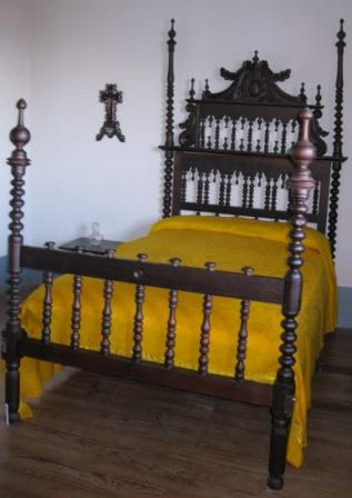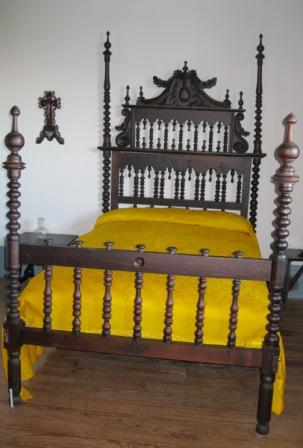 - Cama portuguesa en madeira de castiñeiro torneada con decoración emblemática no cabeceiro. Orgaínzase por medio de catro grandes mastros torneados, máis altos os correspondentes ao cabeceiro, coroados por un pináculo de base bulbosa. O cabeceiro está resolto a modo de peita distribuída en dous pisos organizados en arquerías que alternan balaústres torneados e pinxantes que caen do centro de cada arco; flanquean o edículo dúas volutas acantiformes e eseadas. Resérvase o centro do tímpano resultante para acoller a talla dun froito, quizais un marmelo. Do edículo parten dúas láureas voantes, motivos que axudan a precisar a cronoloxía do moble.