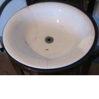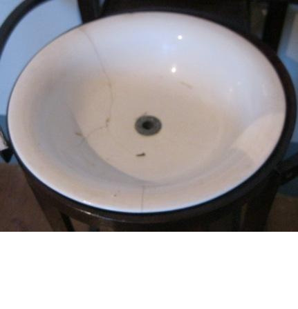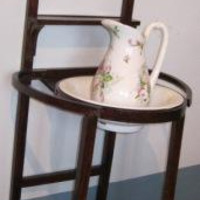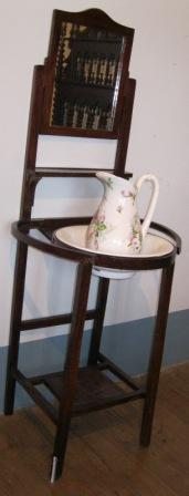 - Palanganeiro en madeira de faia con espello na parte superior e almofía en louza branca. Nos laterais dous saintes para colgar toallas, do tipo que producía Thonet (vid. Nº 924)