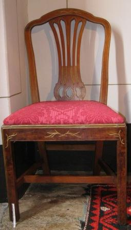 - Cadeira en madeira de caoba. Asento acolchado en tea adamascada con granate. Catro patas afusadas unidas por travesaños. Respaldo cunha sorte de lira (en realidade tipo shieldback)ao estilo Imperio ou Country Chippendale interpretado por Dunchan Phyfe. Da casa Cabezas, en Chantada, copia das cadeiras do XIX da Sala de Armas, froito dun encargo de don José Taboada Zúñiga.