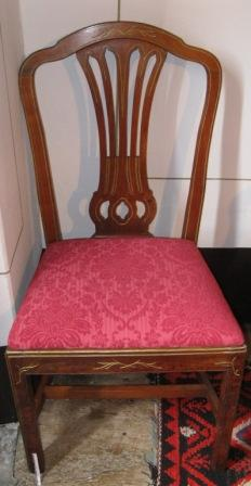 - Cadeira en madeira de caoba. Asento acolchado en tea adamascada en cor granate. Catro patas afusadas unidas por travesaños. Respaldo cunha sorte de lira (en realidade tipo shieldback)ao estilo Imperio ou Country Chippendale interpretado por Dunchan Phyfe. Da casa Cabezas, en Chantada, copia das cadeiras do XIX da Sala de Armas, froito dun encargo de don José Taboada Zúñiga.