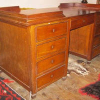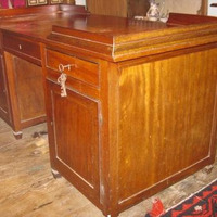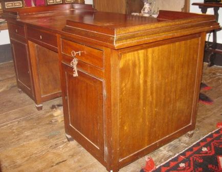- Mesa de despacho en madeira de caoba, coa parte central oca e catro caixóns a cada lateral e unha parte central. Por outro lado, unha lacena en cada lateral cun caixón na parte superior e na central tamén oco cun caixón na parte superior.