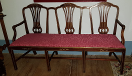 - Sofá tres prazas en madeira de caoba, con apoiabrazos. Apoiado en 8 patas unidas por travesaños. Asento acolchado en tea adamascada de cor granate. Decoración de rameados sobredourados nos frontais e unha sorte de lira no respaldo, ao estilo Imperio ou Country Chippendale.