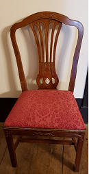 - Cadeira en madeira de caoba con respaldo e asento acolchado tapizado en tea adamascada cor granate. O respaldo vai decorado cunha sorte de lira ao estilo Imperio. Decoracións de rameados nos frontais. Patas afusadas unidas en chambrana. Tipo das que facía Duncan Phyfe.