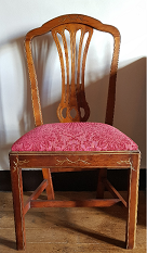 - Cadeira en madeira de caoba con respaldo e asento acolchado tapizado en tea adamascada cor granate. O respaldo vai decorado cunha sorte de lira ao estilo Imperio. Decoracións de rameados nos frontais. Patas afusadas unidas en chambrana. Tipo das que facía Duncan Phyfe.