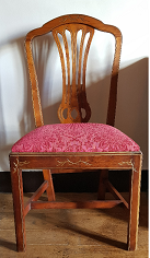 - Cadeira en madeira de caoba con respaldo e asento acolchado tapizado en tea adamascada cor granate. O respaldo vai decorado cunha sorte de lira ao estilo Imperio. Decoracións de rameados nos frontais. Patas afusadas unidas en chambrana. Tipo das que facía Duncan Phyfe.