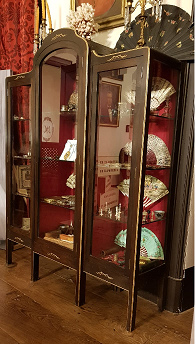 - Vitrina de tres corpos e catro estanterías en cada un deles. Divido en tres rúas, a central máis elevada e rematada en forma curva. Tres portas con cristal biselado. Apoiada en oito patas afusadas. Leva decoración sobredourada de rameados incisos na cara frontal. Da casa Cabezas, en Chantada, froito dun encargo de don José Taboada Zúñiga, a xogo coas cadeiras tipo Chippendale tamén encargadas, copia das do XIX da Sala de Armas e Cuarto do Bispo.