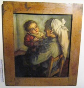 - Lámina a cor que representa a unha anciá co seu neto. Marco en madeira