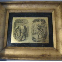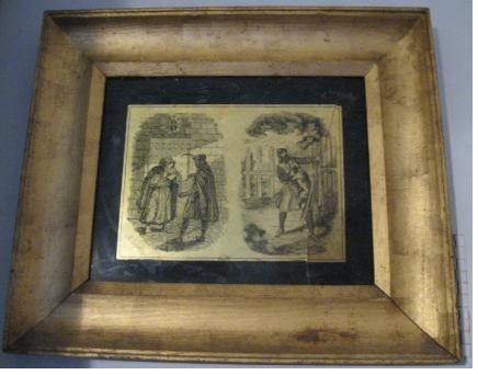 - Gravado que representa en dous paneis dúas escenas literarias ambientadas na Idade Media por identificar. Sobre pan de ouro e cristal. Marco en madeira dourada