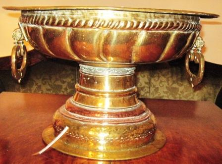 - Braseiro en bronce dourado en forma de pía gallonada con dúas asas laterais avolutadas en forma de C. Apoiado sobre pé circular moldurado.