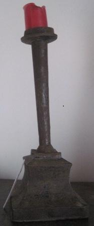 - Candeeiro dunha soa luz en madeira de castiñeiro e ferro. De corpo cilíndrico con progresión volumétrica en altura rematado en bocel voado sobre pedestal troncopiramidal.