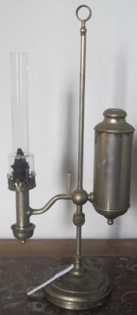 - Lámpada en aliaxe de estaño, tipo Argand. Consta dun pé de base circular con moldura en escocia e un vástago con depósito cilíndrico para o queroseno e un outro lateral para unha lapa con tubo de cheminea de vidro. Pertence ao modelo desenvolvido por Pillischer. Apareceron estas lámpadas cara o ano 1859 en sustitución das de aceite reprobadas por Edgar Allan Poe.