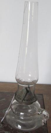 - Lámpada de petróleo en vidro co seu chisqueiro e regulador en folla de lata da patente española Marmen. Depósito con asa.