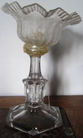 - Lámpada de petróleo en cristal de roca coa base en forma pentagonal e fanal floriforme.