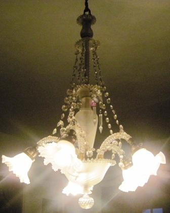 - Lámpada de teito en cristal tipo Real Fábrica de la Granja con cinco brazos con remate en tulipa de cristal.