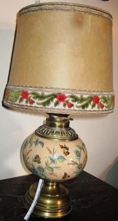 - Lámpada de sobremesa, antigo quinqué de gas adaptado á luz eléctrica, co pé e chisqueiro en bronce, o depósito de globo en porcelana decorada con flores e bolboretas en relevo esmaltado. Pantalla do século XX en tons ocres e cenefa con motivos florais.