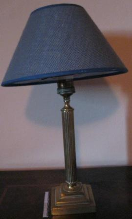 - Lámpada de sobremesa en bronce con pé circular sobre basamento escalonado, vástago en forma de columna de fuste acanalado e capitel estrangulado. A pantalla en tea azul.