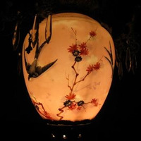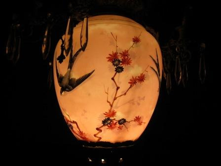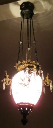- Lámpada de teito, pantalla de vidro opalino rosa decorado con motivos florais e tres andoriñas, de evidente inspiración na estampa xaponesa, rematada na parte superior e inferior en bronce e con soporte para seis lámpadas, brazos calados dos que penden lágrimas de cristal.