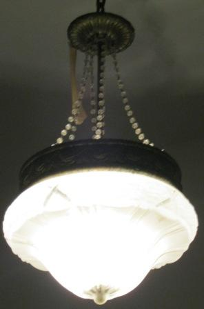 - Lámpada de teito coa súa tulipa en cristal opalino, de forma globular labrada con relevos xeométricos e vexetais. O resto da estrutura consiste nun corpo que recolle a tulipa en chapa de bronce repuxado con grilandas. Colga a través de seis cadeas decoradas con esferas de vidro unidas á copa superior, tamén en chapa.