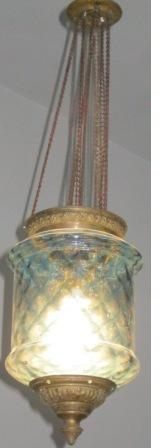 - Lámpada de teito orixinalmente de gas adaptada a electricidade; en cristal tallado azul e remates en bronce labrado e decorados con motivos florais.