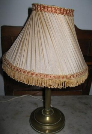- Lámpada de sobremesa con pé en bronce, pé circular e fuste columnario acanalado; pantalla en tea de cor ocre rematada en flecos.