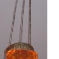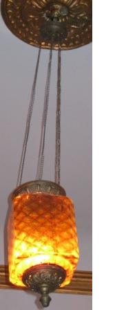 - Lámpada de teito tipo farol, coa tulipa en cristal labrado con motivos xeométricos e vexetais, de cor caramelo. O resto da estrutura, en chapa de bronce repuxado. Orixinalmente de gas, posteriormente adaptada á luz eléctrica. Suxeita con tres cadeas ao teito.