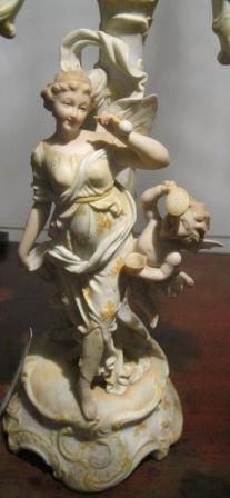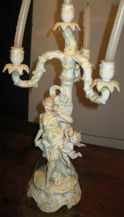 - Candeeiro de catro luces en porcelana tipo biscuit, orixinal da fábrica de Sitzendorf. Desmontábel en dúas pezas, base con figuración e vástago de remate, consta de tres brazos a maiores do central que remata a composición. Decorado con motivos florais e de rocalla, todo él en tons amarelos pasteis. O asunto iconográfico representado podería aludir ao amor no seu sentido tráxico en virtude do mito recreado, ainda que de acordo con esa estética rococó máis xuguetona, sofisticada e frívola que segue a peza, inspirada na pintura dun Fragonard ou dun Boucher, por exemplo. Represéntase a Psyche, ou alma humana, acompañada por un putto que poderíamos identificar con Céfiro, o vento enviado por Cupido para salvar á súa amada. Outra posibilidade é que se trate de Anteros, irmán de Cupido e personificación da vinganza do amor non correspondido. Ela vai ataviada cun chitón, coa cabeleira recollida nun moño e suxeito sobre da testa cunha cinta, e descalza. Os dous con ás de bolboreta, o seu atributo máis evidente (tanto de Psyche como de Anteros e o propio Céfiro). Onde a traxedia? Psyche e Anteros/Céfiro sopran pompas de xabrón, emblema clásico da fugacidade do tempo e polo tanto, do amor, coma así lle aconteceu a Psyche.