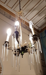 - Lámpada de teito en bronce, de brazos calados con decoración floral e de palmeta, dos que penden lágrimas prismáticas de cristal.