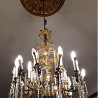 - Lámpada de teito con cinco brazos en bronce, con catro candeas para cada brazo e lágrimas prismáticas, facetadas, de cristal. Antigamente era de candeas e foi adaptada posteriormente á electricidade.