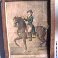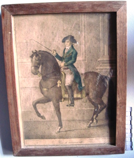 - Gravado que representa a un xinete montando a cabalo. Marco de madeira. Augaforte de Francisco Muntaner Moner (1743-1805) sobre debuxo orixinal de Antonio Carnicero (1748-1814). Orixinalmente tería sido un retrato ecuestre de Godoy, logo alterado. Formaba parte dunha serie destinada a ilustrar a tradución de Cerdá da obra de Dupaty de Clam, Practique de l'Equitation ou l'art de l'Equitation reduit en principes, Paris, 1769. Reimpresión da casa de Litografía fundada por Simeón Durà, Valencia.