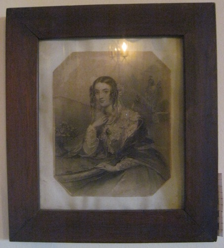 - Gravado de William Egleton a partir dun debuxo orixinal de John Hayter, retrato de pose artificiosa, arquetípica dos retratos oficiais dos primeiros anos da época vitoriana, de Elizabeth Catherine Gubbins, vizcondesa de Falkland e duquesa de Saint Albans. Precisamente, a muller vai acompañada con tres falcóns como atributo iconográfico do seu título. Perfil da contorna no seu orixinal octogonal. Marco en madeira.
