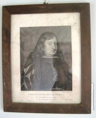 Gravado que representa a D. Juan José de Austria, fillo de Felipe IV, litografía de Agapito López de San Román (1801-7) a partir do retrato orixinal do pintor Juan Carreño de Miranda, baixo a dirección de José de Madrazo, no Real Establecimiento Litográfico de Madrid. Trátase dun dos exemplares daquel proxecto ambicioso desenvolvido por Madrazo, a chamada Colección litográfica de los cuadros del rey de España el señor don Fernando VII, que pretendía difundir as obras da colección real existentes no Museo aberto en 1819 que logo sería o Prado. Marco en madeira.