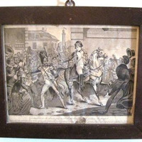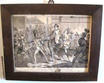 - Gravado da casa Dopter que representa a Napoleón a cabalo abríndose paso entre unha multitude que o aclama namentres un granadeiro trata de apartar á xente. Marco en madeira.