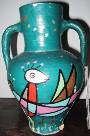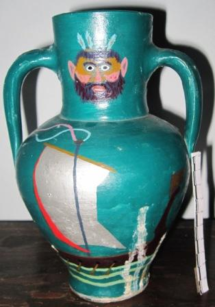 - Ánfora mallorquina en cerámica policromada, de dúas asas, fondo de cor verde, decorado no galbo con dúas aves e un trirreme tipo grego; no colo, o mascarón de Oceanus.