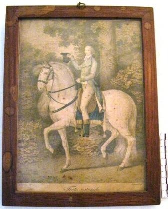 - Gravado a cor que representa a un xinete montando a cabalo. Marco en madeira. É un augaforte de Rafael Esteve Vilella (1772-1847) sobre debuxo orixinal de Antonio Carnicero (1748-1814). O xinete é o retrato de Fernando de Borbón, rei das Dúas Sicilias. O título do debuxo orixinal de Carnicero era "El Pasaje. Retrato del Príncipe de Parma". Formaba parte dunha serie destinada a ilustrar a tradución de Cerdá da obra de Dupaty de Clam, Practique de l'Equitacion ou l'art de l'Equitacion reduit en principes, Paris, 1769. Reimpresión da casa de Litografía fundada por Simeón Durà, Valencia.